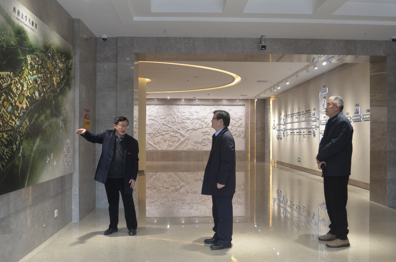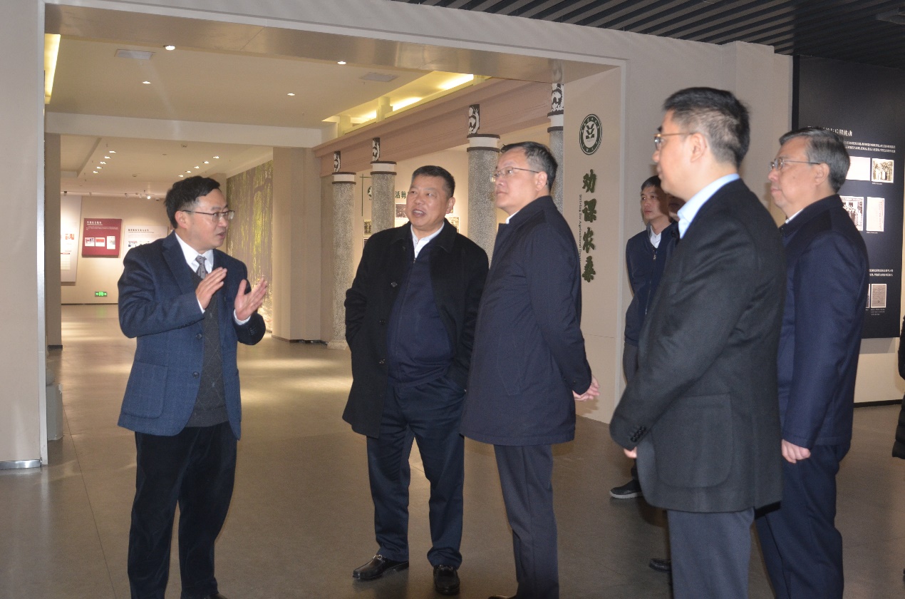 7、1月29日,教育部副部长杜江峰(左三)一行20人参观校史馆。党委书记张卫国(左二)、校长王进军(右一)陪同。讲解员:郑劲松副馆长。