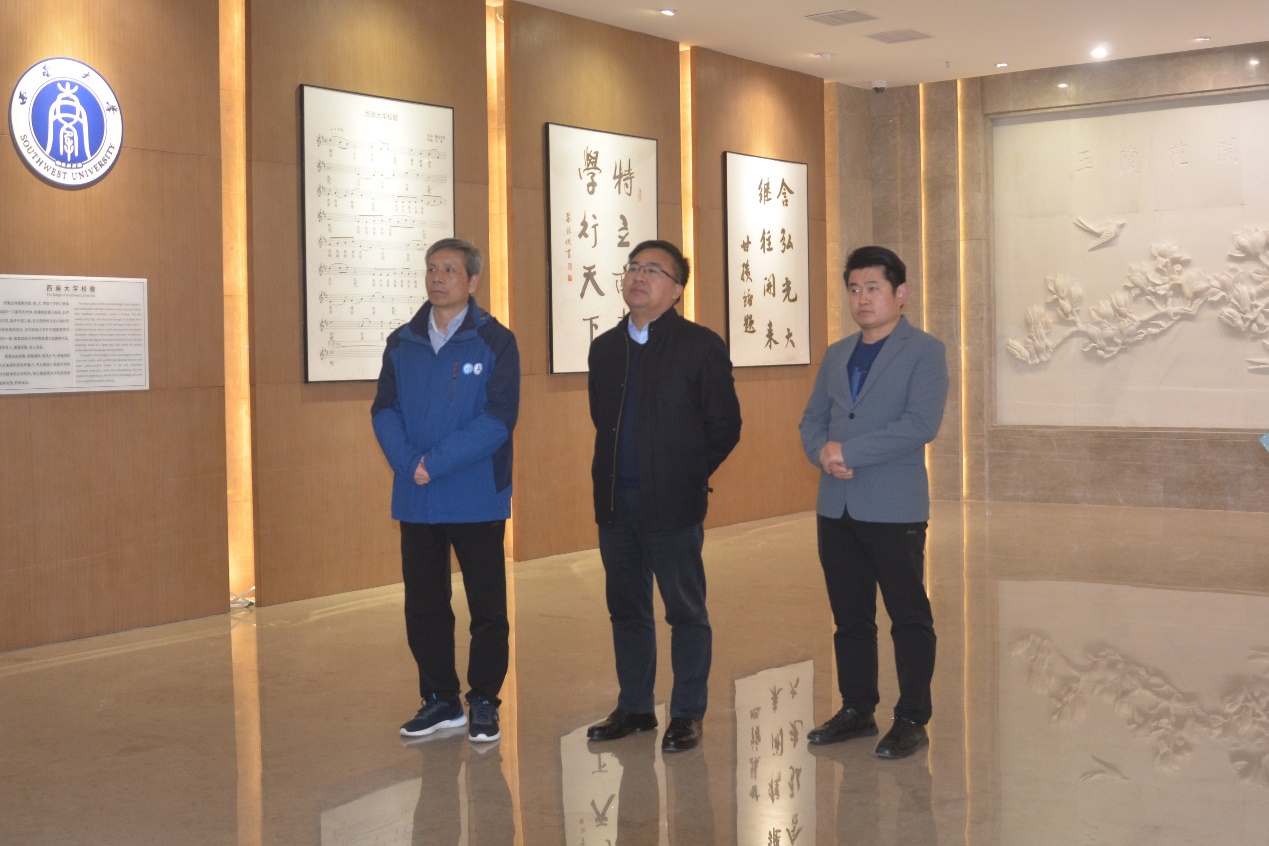 16、11月30日,内蒙古民族大学副校长陈英松(图中右三)一行5人参观校史馆。西南大学出版社总编辑兼期刊社社长张陈(图中右二)陪同。讲解员:郑劲松副馆长。