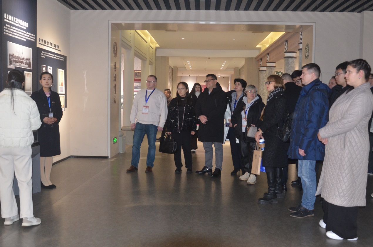 6、12月12日,白俄罗斯总统办公厅经济管理局副局长霍穆托夫斯基(图中左七)一行31人参观校史馆。讲解员:侯语卓。