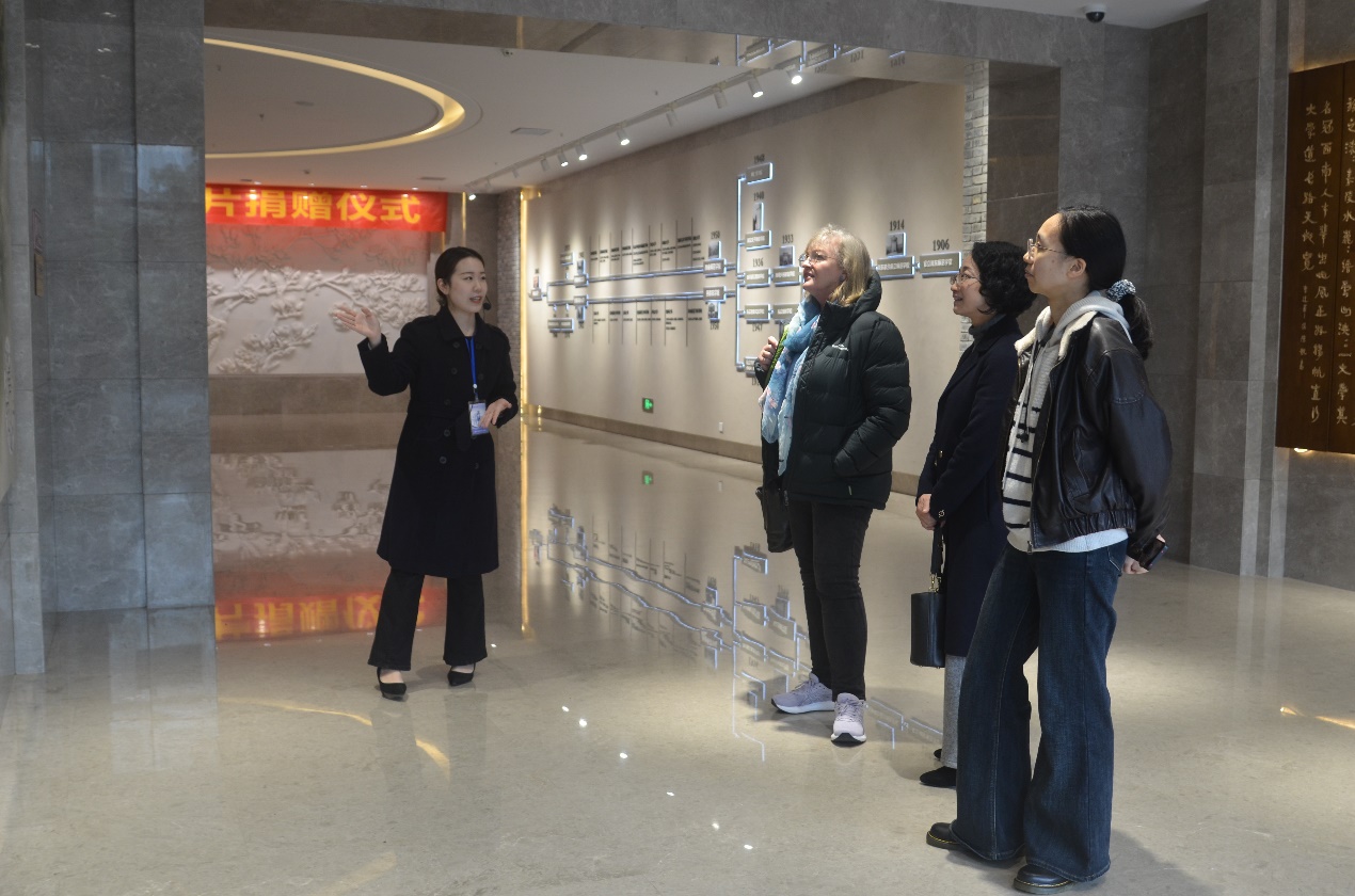 5、12月11日,新西兰怀卡托大学副校长(图中左二)一行3人参观校史馆。讲解员:李盈洁。