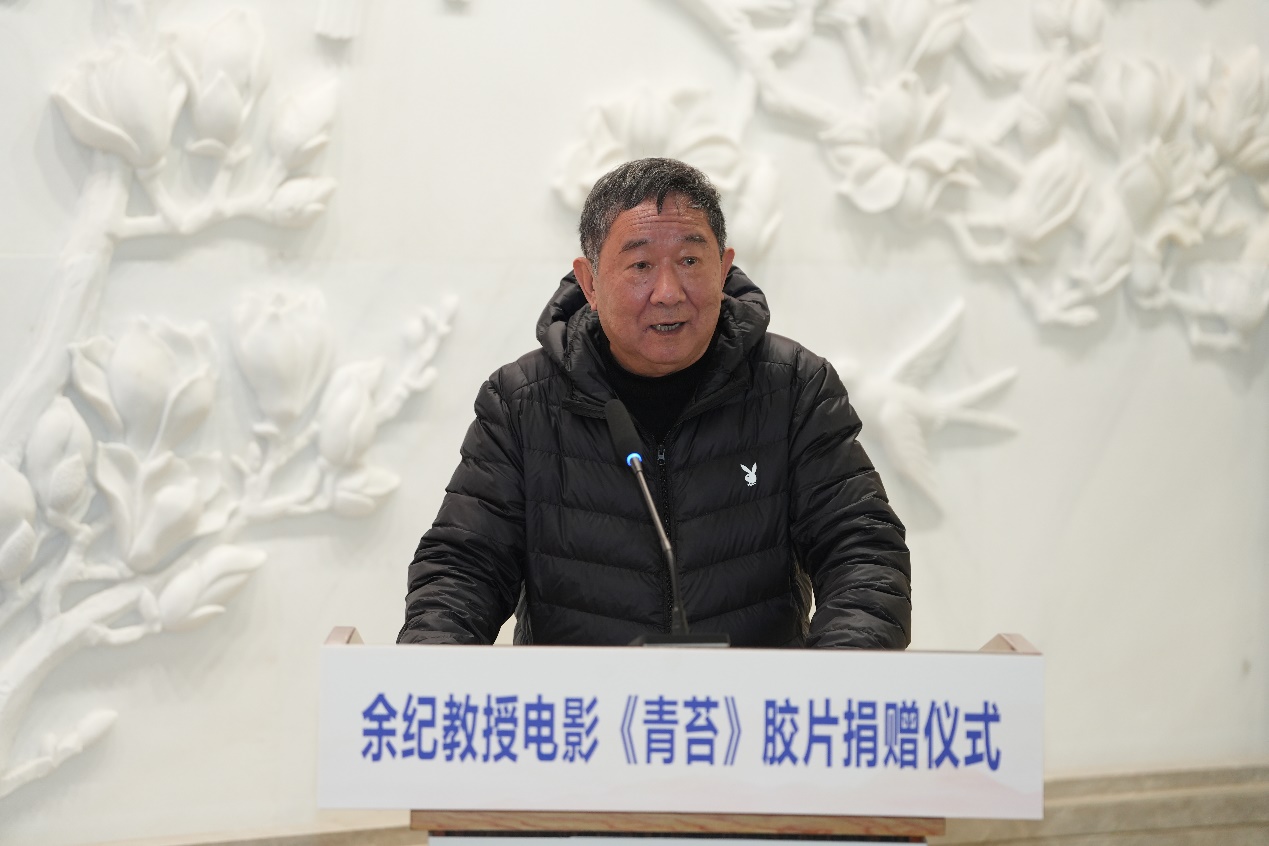 余纪教授分享了捐赠感言,重点讲述了自己从事电影理论教学和电影创作之路,并对文学院电影学科的发展寄予厚望。余教授还简约分享了电影《青苔》的创作经历。该片系抗战题材,反映的是抗战时期逃难到重庆的普通人生活状态,描写他们顽强的生命意志和不屈不挠的幸福渴望,于西南大学合并组建的2005年正式公映,主要演职人员大多来自西南大学,且所有镜头全部在北碚区金刚碑古镇拍摄完成。“所以,这部电影也从一个侧面记录了我校师生参与主题文化艺术创作的校史故事。把《青苔》胶片捐赠给母校档案馆、校史馆收藏,有着特别的意义和价值”余纪教授说。